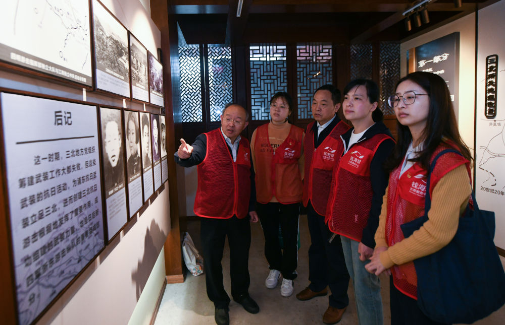 ↑2021年4月23日,浙江慈溪市錢海軍志愿服務中心黨支部的黨員在浙東抗日根據地舊址參觀學習。