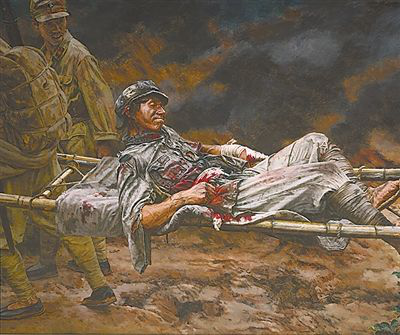 這幅油畫中的主人公是陳樹湘,油畫上方寫著的“為蘇維埃流盡最后一滴血”,是他的真實寫照,也是他率領(lǐng)的紅34師的真實寫照。