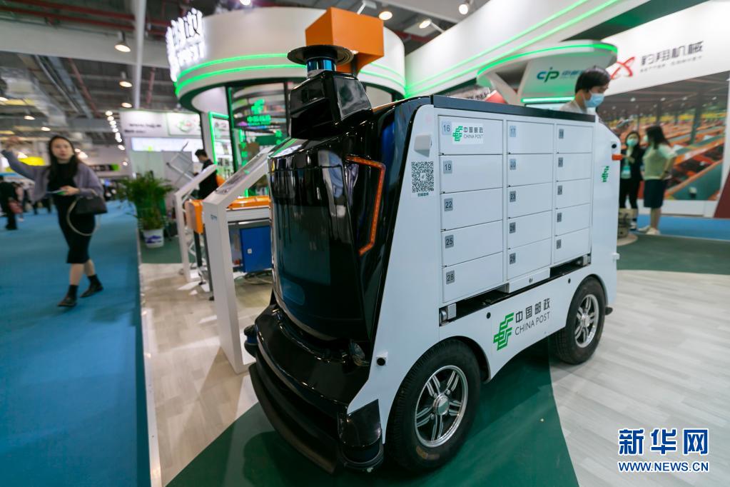 4月27日在中國(guó)郵政展區(qū)前拍攝的無人投遞車,無人投遞車主要應(yīng)用于小區(qū)、園區(qū)、校園等封閉和半封閉的場(chǎng)景。