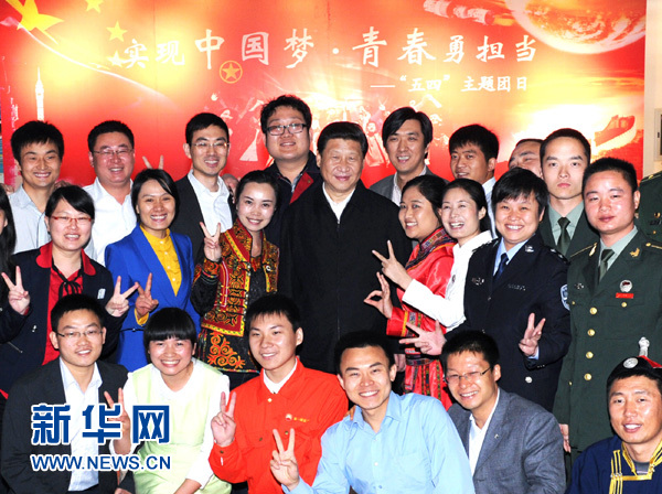 2013年5月4日,中共中央總書記、國家主席、中央軍委主席習近平來到中國航天科技集團公司中國空間技術研究院,同各界優秀青年代表座談并發表重要講話。這是座談會前,習近平和在展廳參觀的優秀青年代表合影。新華社記者 饒愛民 攝