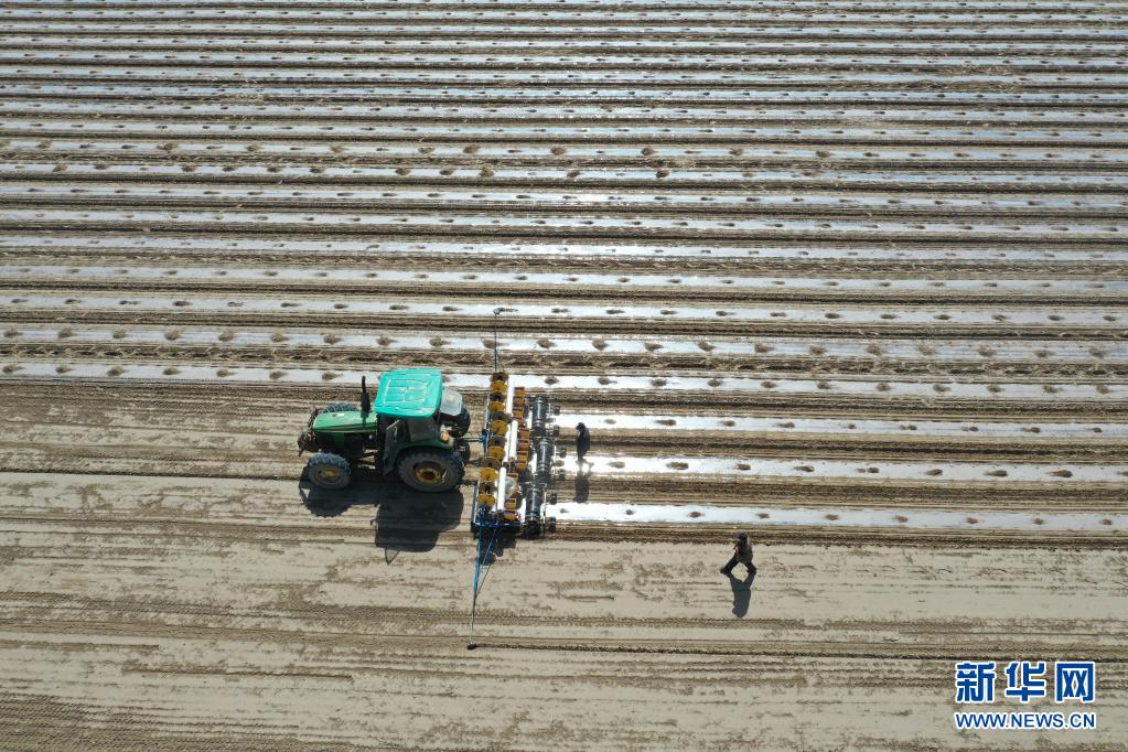 棉農(nóng)在喀什地區(qū)莎車縣播種“中棉所127”品種棉花(4月11日攝,無人機(jī)照片)。