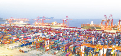 2020年3月20日,多艘超大型集裝箱船停泊在上海洋山港自動化碼頭,現場作業一派繁忙。