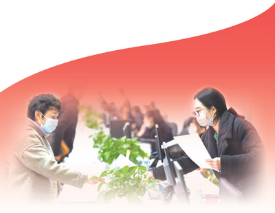 2021年2月18日,在湖北省荊州市政務(wù)服務(wù)中心,工作人員在為群眾辦理事項。