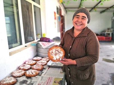 新疆哈密市伊吾縣下馬崖鄉(xiāng)八一小區(qū)的賽旦木·麥麥提看到高速公路開通后的發(fā)展勢頭,和兩個姐妹合伙建起了打馕合作社,每人每月都有2000多元的收入。本報記者 王瑟攝/光明圖片