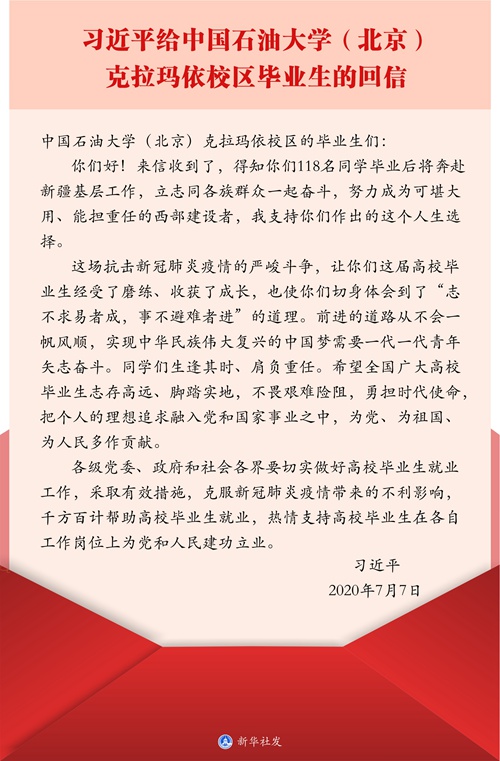 圖表:習(xí)近平給中國(guó)石油大學(xué)(北京)克拉瑪依校區(qū)畢業(yè)生的回信 新華社發(fā)