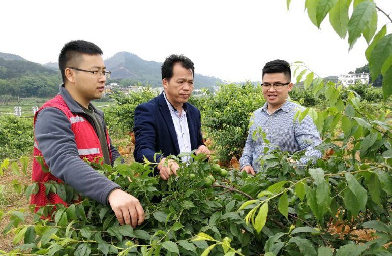 △廣西馬山縣林圩鎮伏興村駐村第一書記周福波(左一)在查看村里已經掛果的三華李。