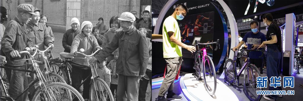 這是一張拼版照片:左圖為1982年,山東省寧津縣杜集公社李鎮(zhèn)大隊社員高高興興地買回新自行車(新華社記者李錦 攝);右圖為2021年5月8日,在海南舉行的首屆中國國際消費品博覽會旅居生活/消費服務展區(qū),觀眾在體驗時尚運動自行車(新華社記者金立旺 攝)。