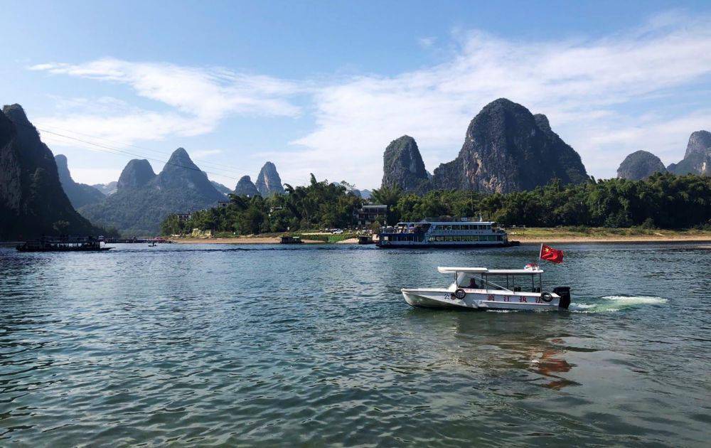 ↑執法船在漓江上巡查(2019年11月14日攝)。