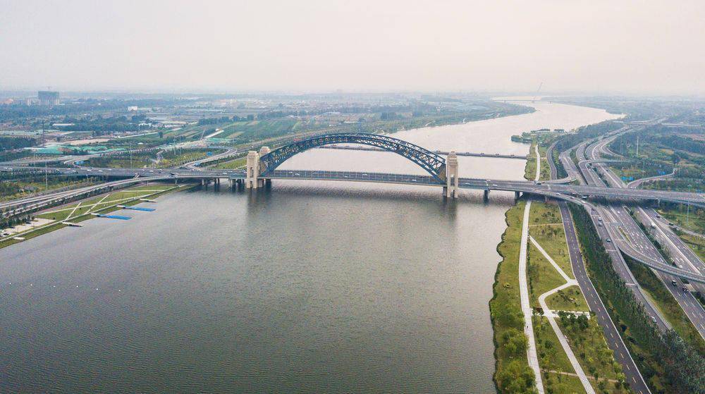 ↑2020年9月21日在山西太原拍攝的汾河三期治理工程晉陽橋段(無人機照片)。
