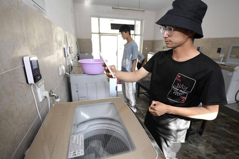 ↑ 寧夏建設職業技術學院學生在洗衣房通過APP掃碼進行計量式用水(5月12日攝)。
