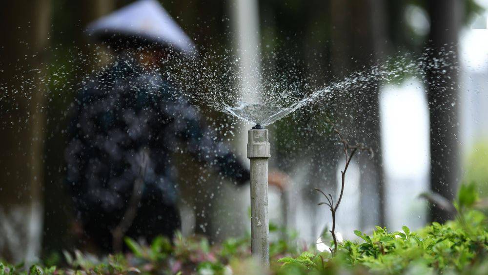 ↑ 在廣西欽州市,一名工人在調節節水型噴灌龍頭給道路綠化帶澆水(5月11日攝)。