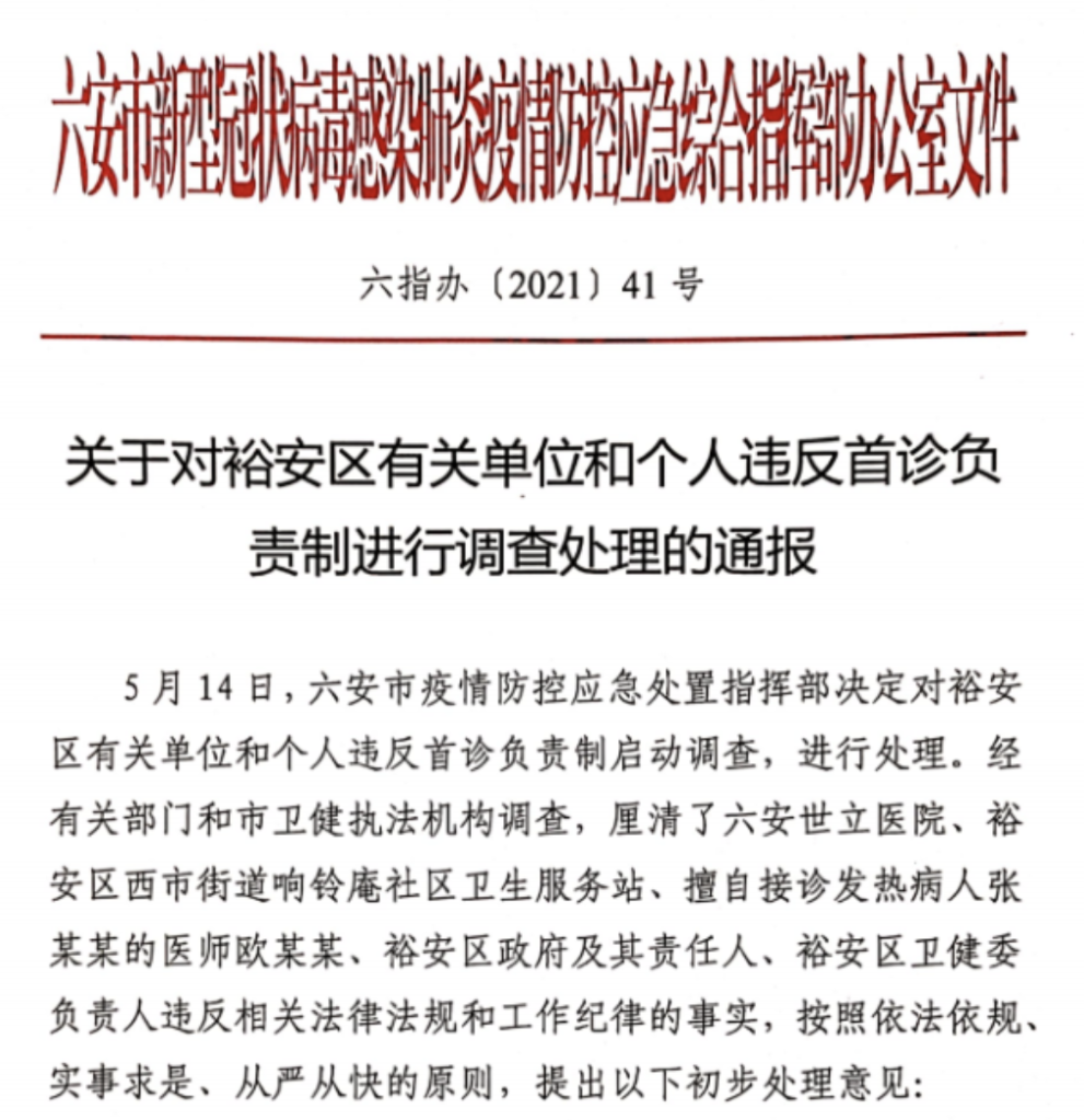 同日,兩省相繼通報問責相關單位和個人,均提及首診責任不落實等問題。根據通報,責令安徽六安世立醫院停業整頓,對相關負責人予以處分、撤職、解聘等處理;擅自接診發熱病人的六安醫師歐某某,被移交司法機關;遼寧營口李波診所予以關停;給予遼寧省衛健委副主任、營口市副市長等人誡勉談話;免去李紅陽鲅魚圈區副區長職務等。