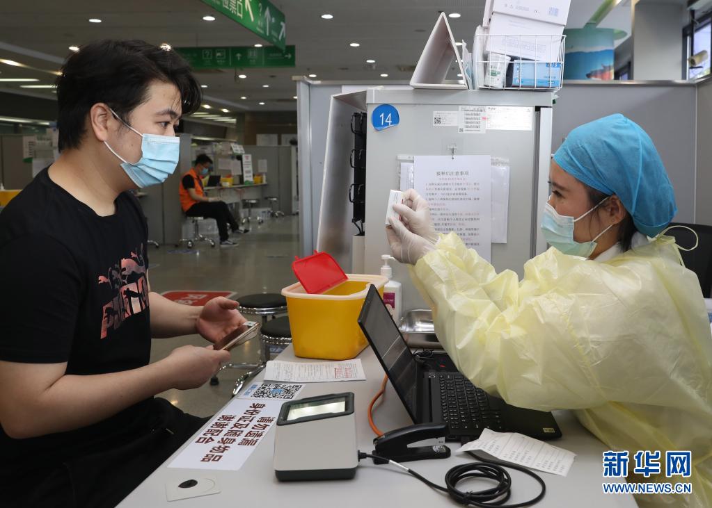 5月18日,在上海市徐匯區凱旋南路接種點,護士在注射前向市民展示腺病毒載體疫苗信息。