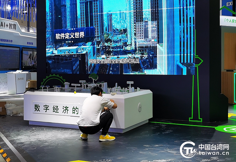 第五屆世界智能大會將于20日在天津梅江會展中心開幕。圖為工作人員正在進行最后階段的調試、完善、布展等工作。(中國臺灣網(wǎng) 張亞靜 攝)