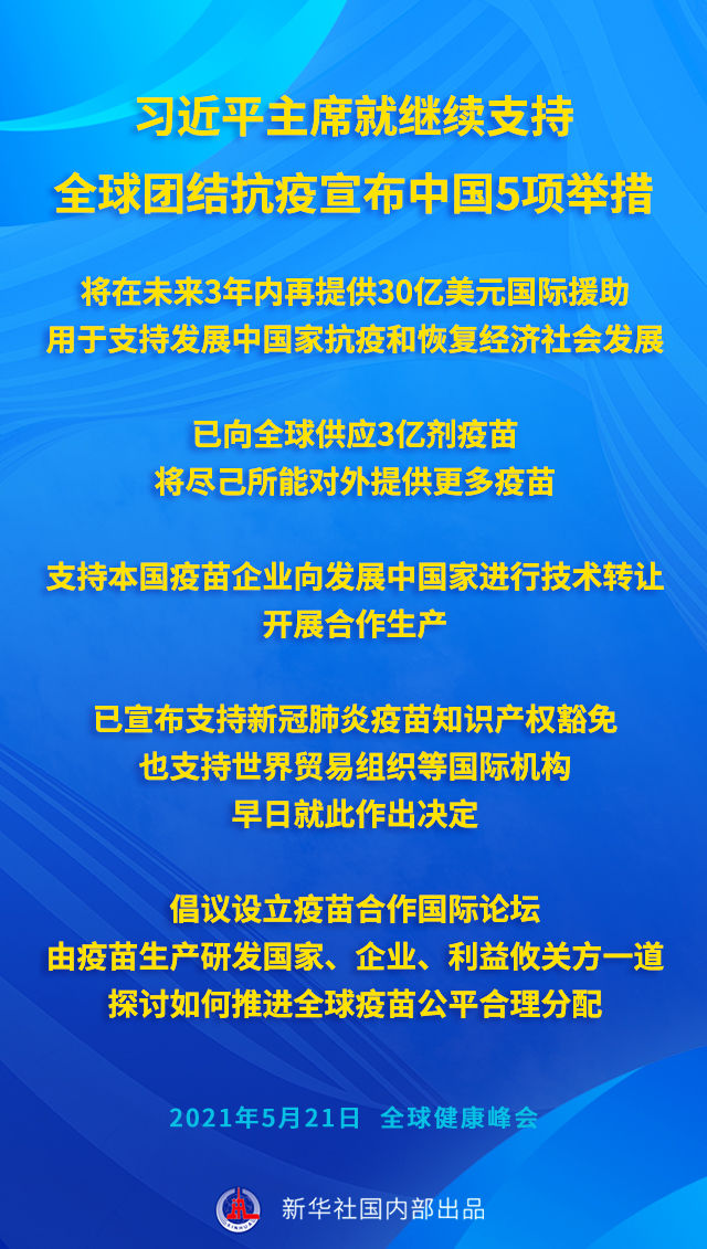 2021年5月,面對全球疫情的起伏反復,著眼全人類共同需求,習近平主席在全球健康峰會上又提出5點意見、宣布5項新舉措。