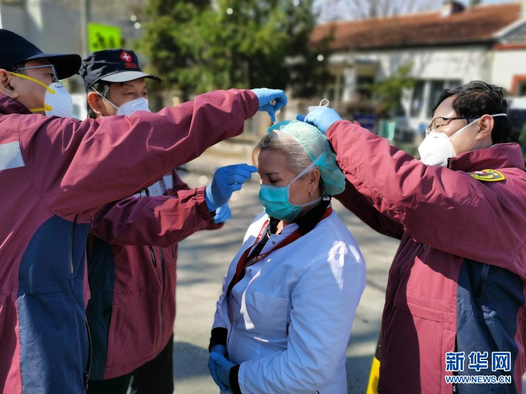 2020年4月4日,中國赴塞爾維亞抗疫醫(yī)療專家組在貝爾格萊德的基層發(fā)熱門診為門診主任特里富諾維奇(中)更換防護標準更高的口罩。新華社發(fā)