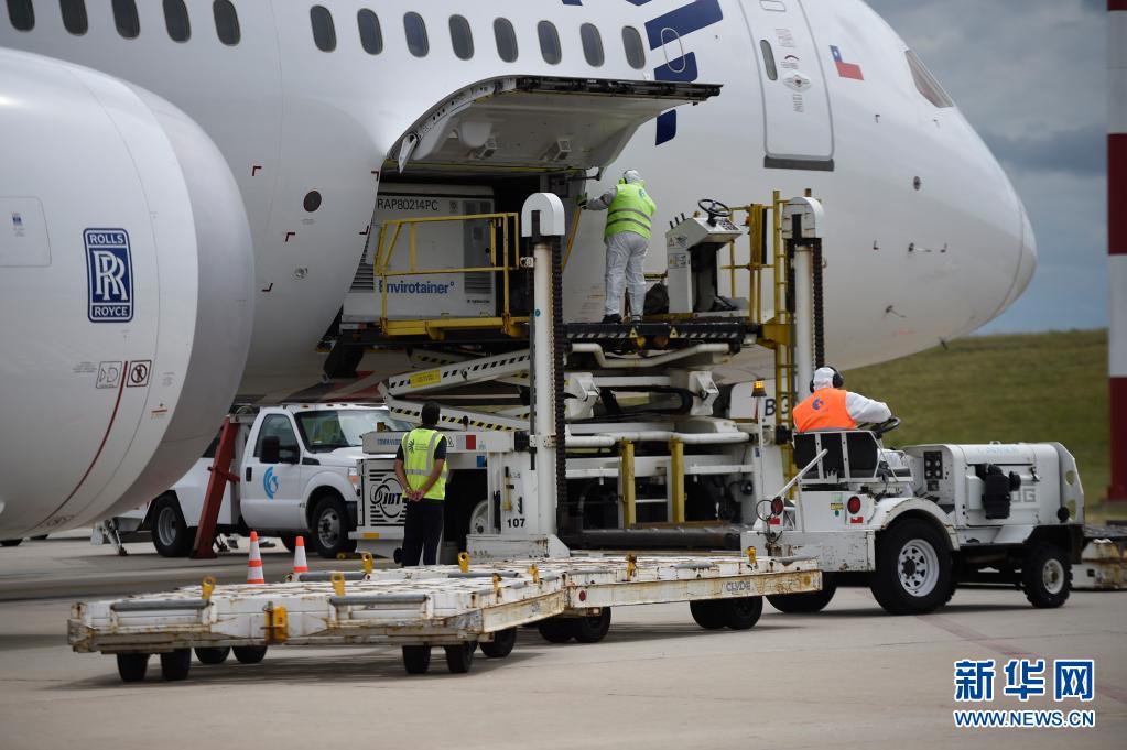 2021年3月16日,在烏拉圭首都蒙得維的亞,工作人員從飛機上卸載中國科興新冠疫苗。新華社發(fā)(尼古拉斯·薩拉亞 攝)