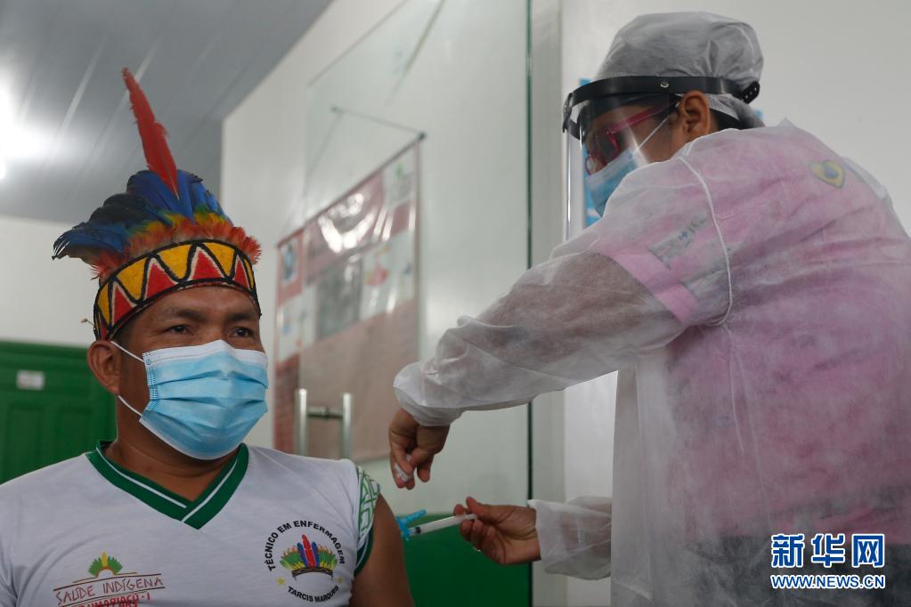 2021年1月19日,醫(yī)護人員在巴西亞馬孫州塔巴廷加市為一名原住民接種中國新冠疫苗。新華社發(fā)(盧西奧·塔沃拉攝)