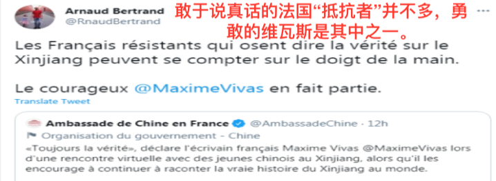 有網友轉發中國駐法國大使館推文并評論說:敢于說真話的法國“抵抗者”并不多,勇敢的維瓦斯是其中之一。