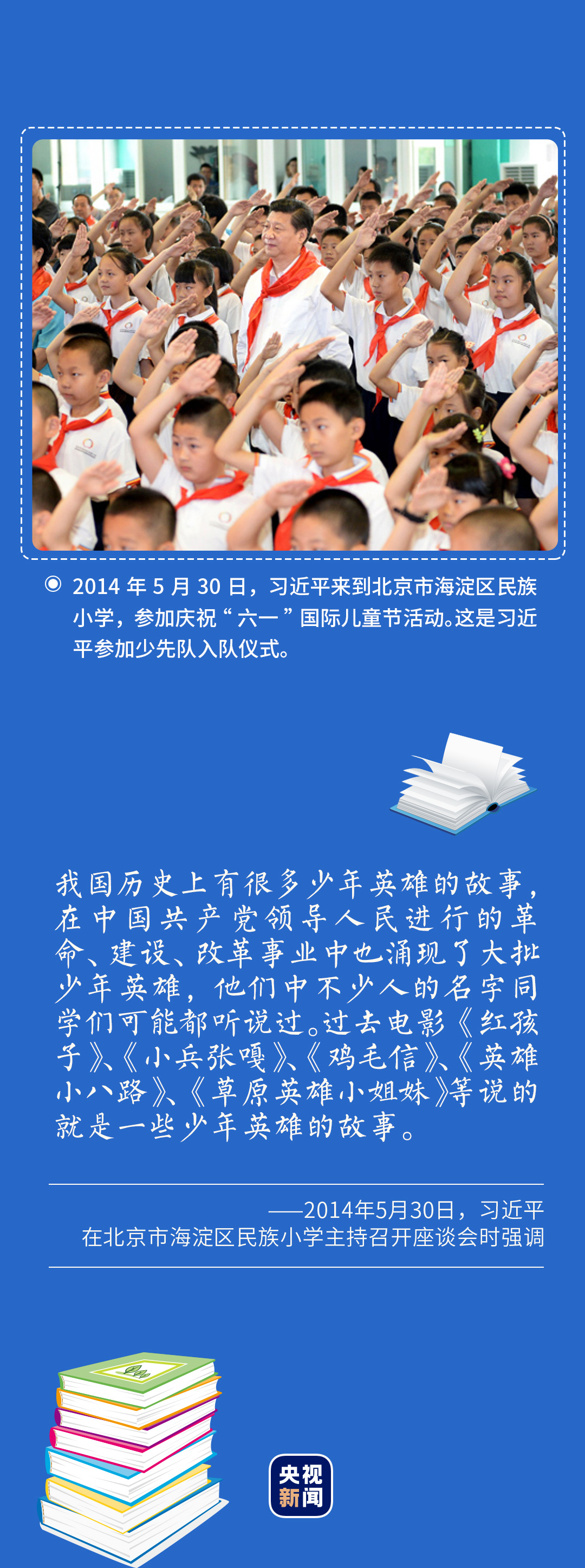 2014年5月30日,習近平總書記來到北京市海淀區民族小學,參加慶祝“六一”國際兒童節活動。在與少先隊輔導員、教師、家長、學生代表座談時,總書記叮囑,要心有榜樣,學習英雄人物、先進人物、美好事物,在學習中養成好的思想品德追求。