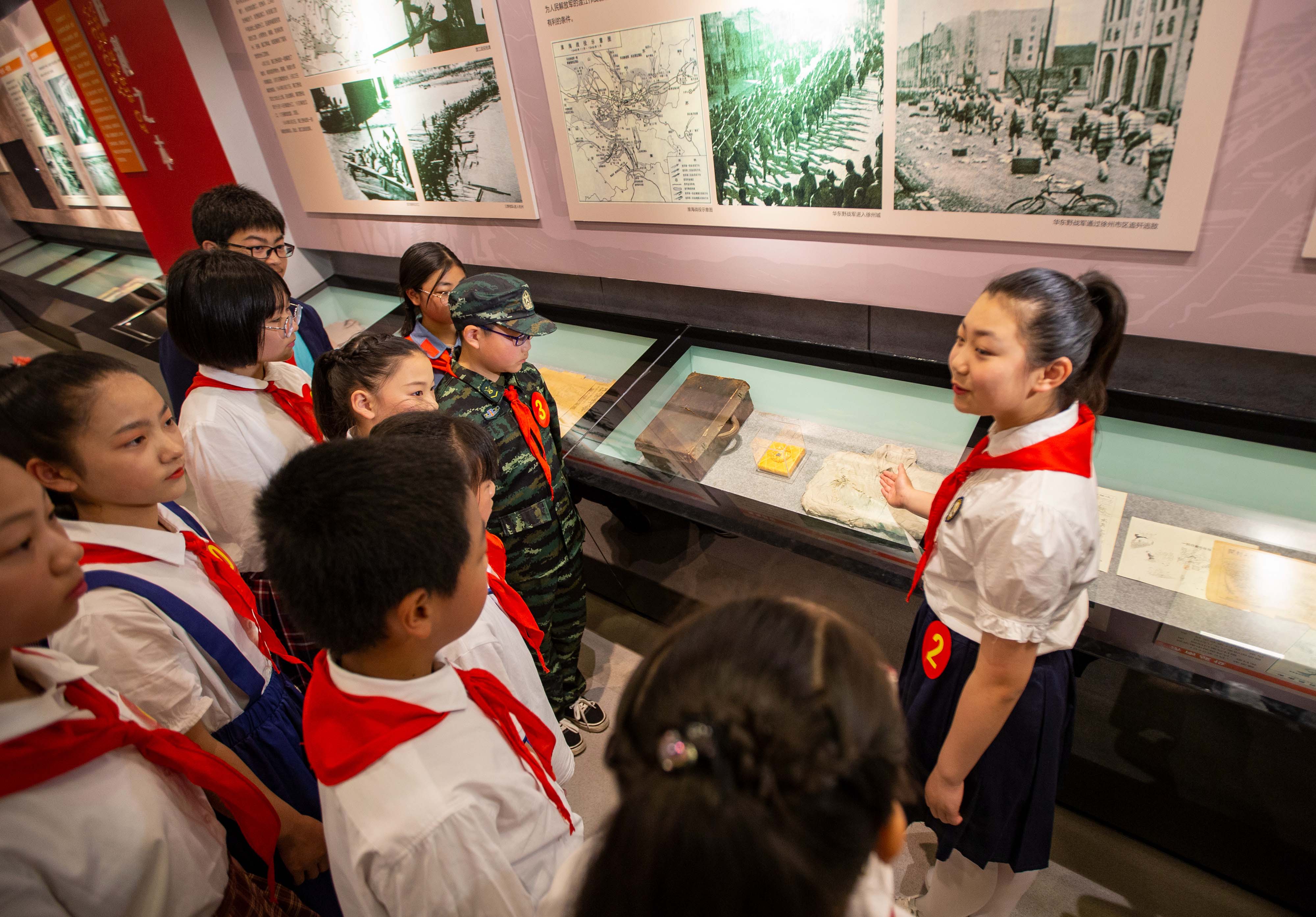 △2021年5月27日,在江蘇省南通市海安市的蘇中七戰七捷紀念館,小小紅色講解員在給同學們講述紅色故事。