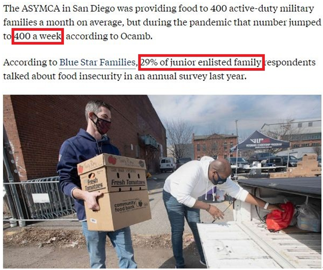 在新冠肺炎大流行期間,許多美國低收入者的食品安全狀況急劇惡化,軍人家庭也未能幸免。事實上,饑餓和經濟焦慮是美國軍人家庭多年來一直面臨的問題。