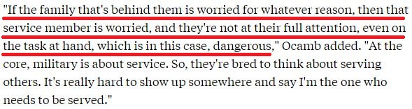 針對美國軍人家庭的境遇,ASYMCA組織營銷主管多琳·奧坎布認為,如此對待這些服務于國家的人于理不通,而且隱患巨大!叭绻砗蟮募胰颂幱诮箲]之中,那么軍人自身也會憂心忡忡,以至于無法全身心執行任務。這種情況無疑是很危險的”。