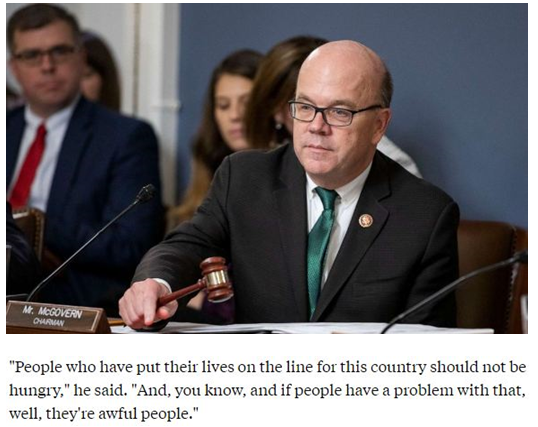 正在參與應對美國饑餓問題的美國會眾議院規則委員會主席吉姆·麥戈文也認為,軍人家庭為吃飯發愁是不可接受的事情!盀檫@個國家獻出生命的人們不應該挨餓。如果有誰覺得這話不對,那么他們就是壞人”。