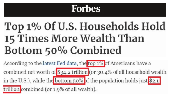 美聯儲最新數據顯示,美國最富有的1%人口的凈資產總額達到34.2萬億美元,占美國所有家庭財富的30.5%;最貧窮的50%人口的凈資產總額僅為2.1萬億美元,占美國全部財富的1.9%。換言之,1%美國超級富豪的財富是50%美國窮人財富的15倍。