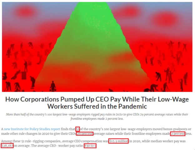 美國政策研究學會(IPS)近期調查發現,在疫情期間低收入工人失去收入、工作甚至生命的同時,美國許多頂級企業卻一邊以疫情為借口大舉裁員,一邊挖空心思為企業高管牟取不正當暴利。