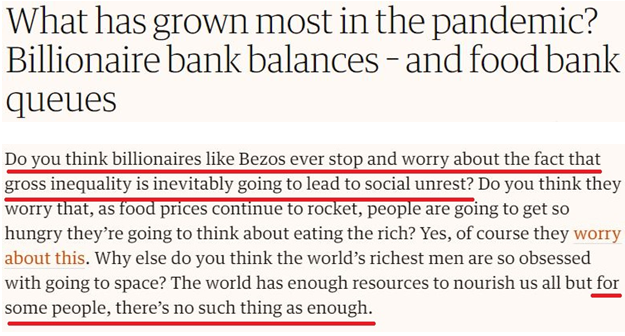 英國《衛報》日前以《疫情中增長最快的是什么?億萬富翁的存款和食物救濟站前的長隊》為題發文譏諷說,在美國這樣的國家,一些人的災難往往成為另一些人的發財機會!澳阏J為像(亞馬遜老板)貝索斯這樣的億萬富翁會停下手來擔心嚴重的不平等將不可避免地導致社會動蕩嗎”,“對于有些人來說,沒有夠了的時候”。