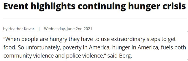 在他看來,饑餓、貧窮、暴力以及種族沖突等現象之間存在著密切關聯。“當人們饑餓時,他們不得不采取特別手段來獲得食物。所以不幸的是,美國的貧困和饑餓同時助長了社區暴力和警察暴力”。