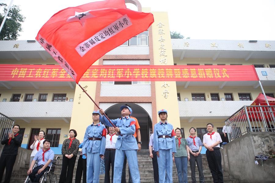 圖為金寨縣皮定均紅軍小學的學生揮舞紅軍小學校旗。新華社發 劉長龍 攝