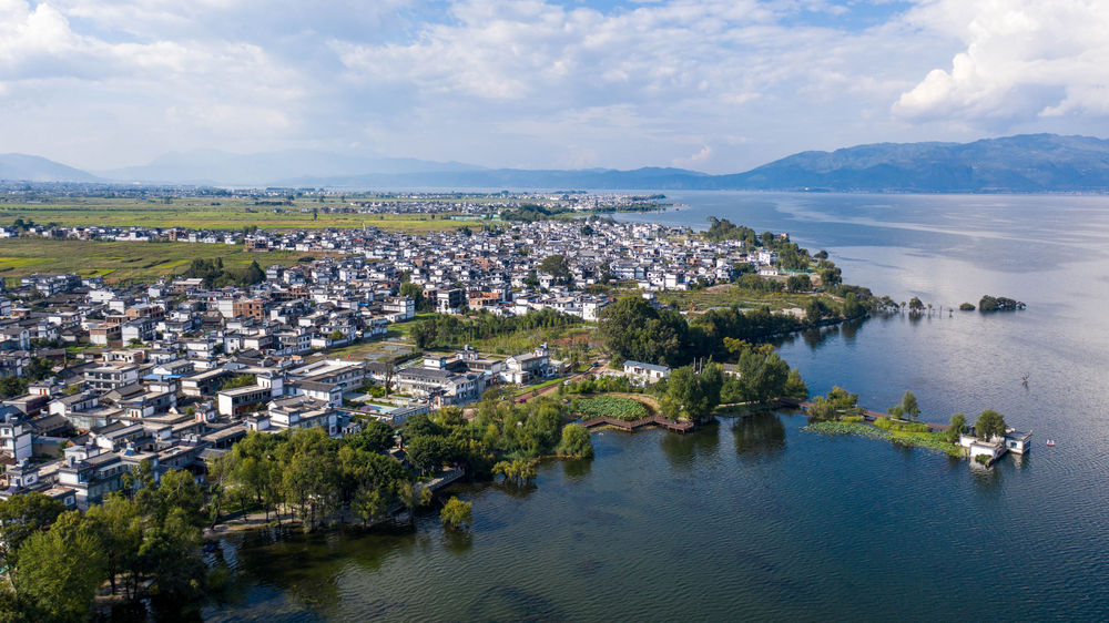 云南省大理市古生村村貌與洱海風光