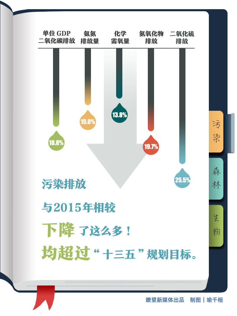 污染更少,減排更有效。二氧化硫、氮氧化物、化學(xué)需氧量、氨氮排放量較2015年分別下降25.5%、19.7%、13.8%、15.0%,單位GDP二氧化碳排放較2015年降低18.8%,均超過“十三五”規(guī)劃目標(biāo)。