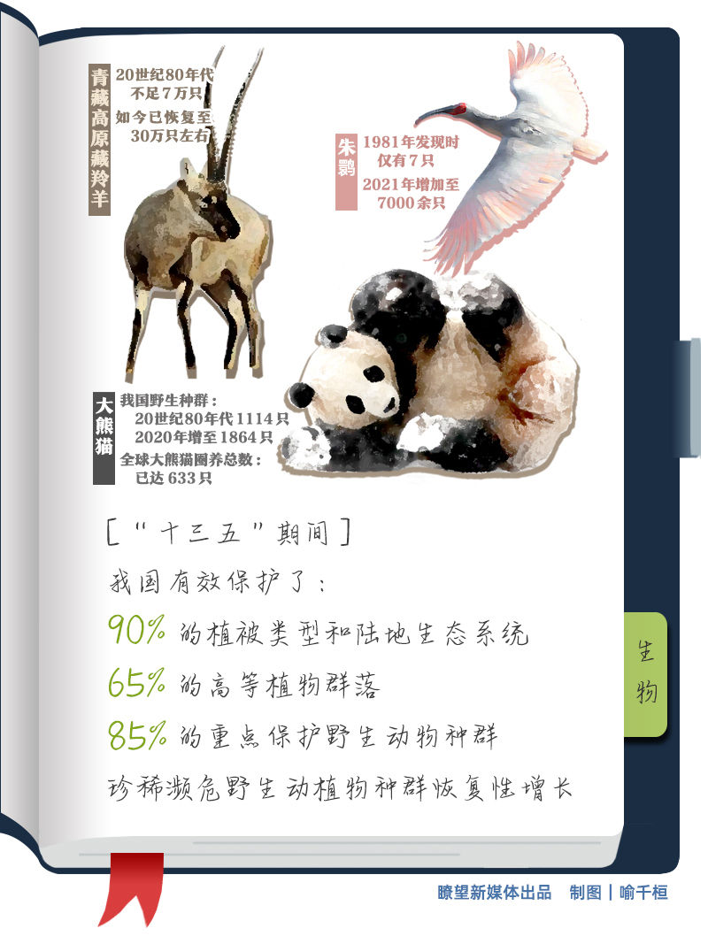 瀕危野生動植物保護(hù)不斷強化。“十三五”期間,我國有效保護(hù)了90%的植被類型和陸地生態(tài)系統(tǒng)、65%的高等植物群落,85%的重點保護(hù)野生動物種群,大熊貓、朱鹮、藏羚羊、蘇鐵等珍稀瀕危野生動植物種群實現(xiàn)恢復(fù)性增長。