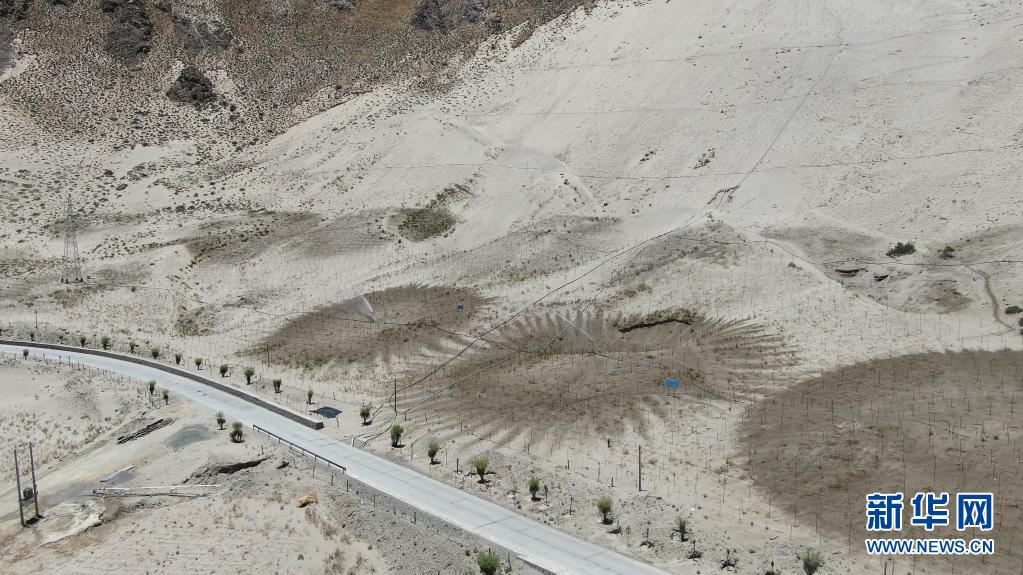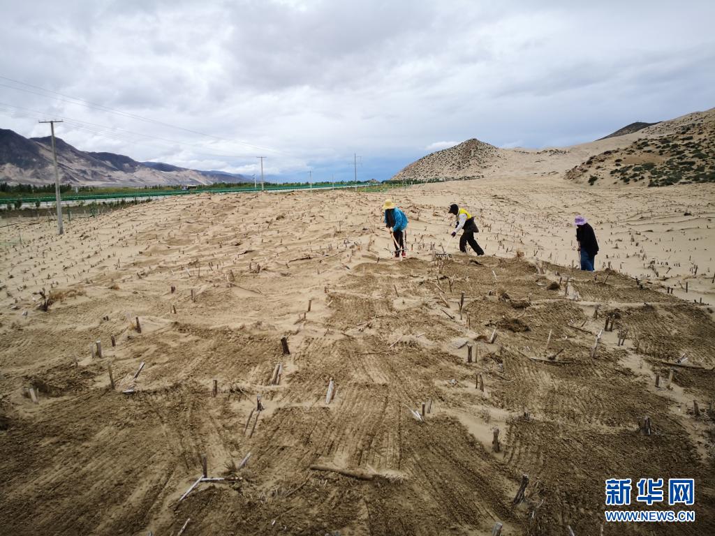 在山南市雅魯藏布江河谷地帶,村民們在維護固沙用的草方格(2019年7月14日攝)。新華社發(資料照片)