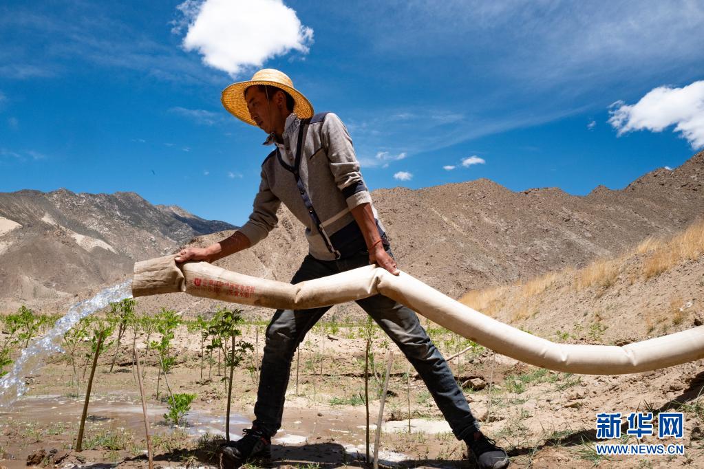 山南市貢嘎縣吉雄鎮劉瓊村村民正在為樹苗澆水(6月2日攝)。新華社記者 普布扎西 攝