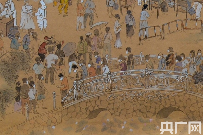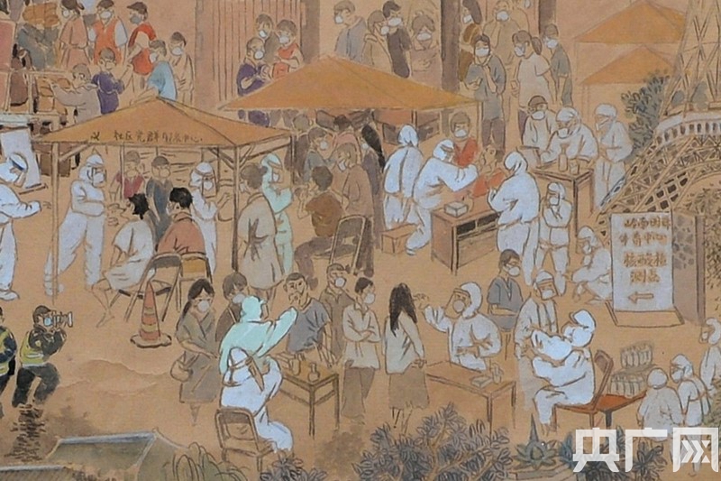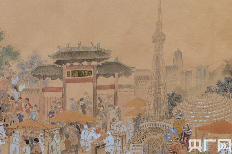畫卷的整體風格延續了《清明上河圖》的表現手法,大到西樵山、佛山祖廟、嶺南明珠體育館、佛山西站等地標,小到帶著口罩排隊的居民、身著防護服的醫務人員、穿起紅色馬甲的志愿者、全副武裝的消毒人員,甚至扛著長槍短炮的新聞記者也躍然紙上。