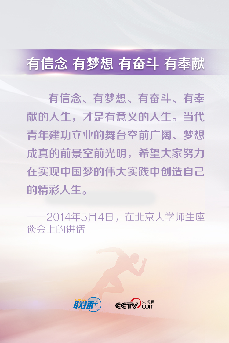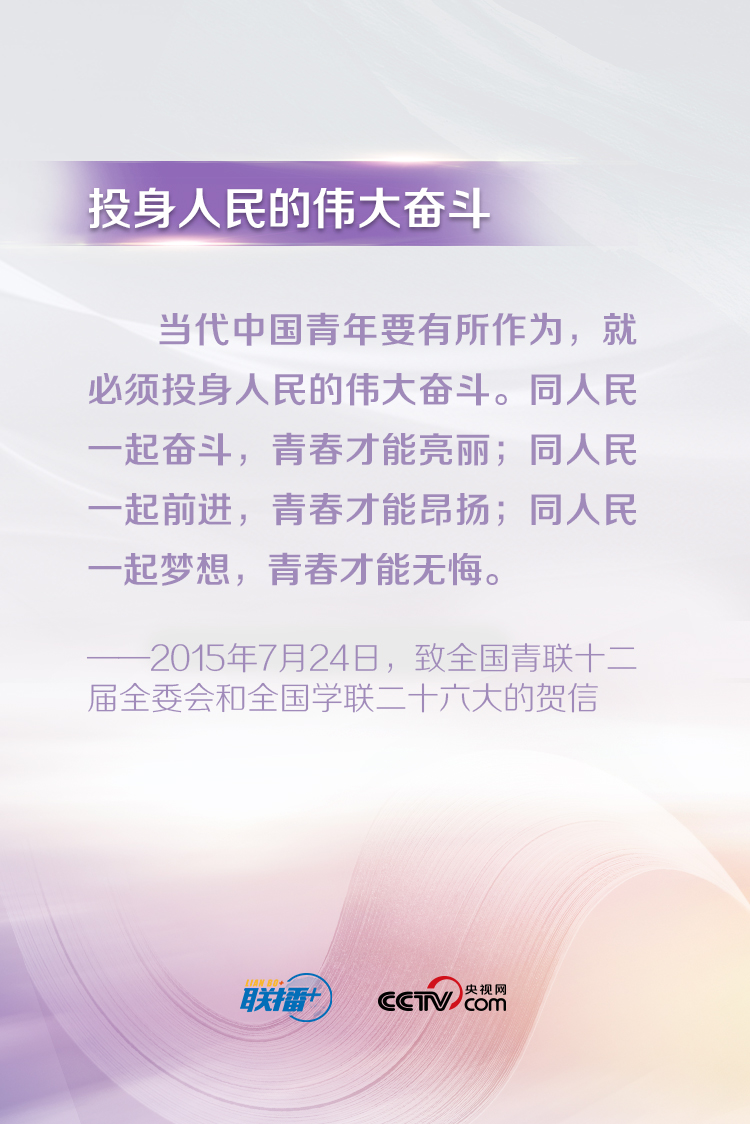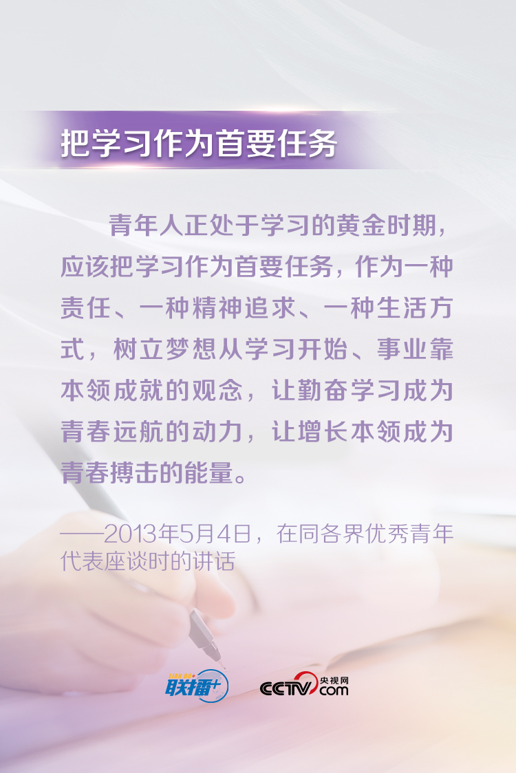 習近平總書記一直以來都十分關心青年成長成才,常常走近青年、傾聽青年、鼓勵青年。他說,“青年最富有朝氣、最富有夢想”,“中華民族偉大復興終將在廣大青年的接力奮斗中變?yōu)楝F(xiàn)實”。央視網(wǎng)《聯(lián)播+》特梳理總書記對廣大青年的寄語,與您一起學習。