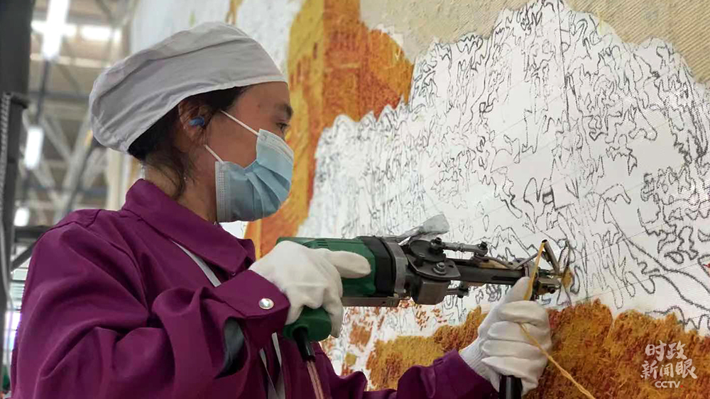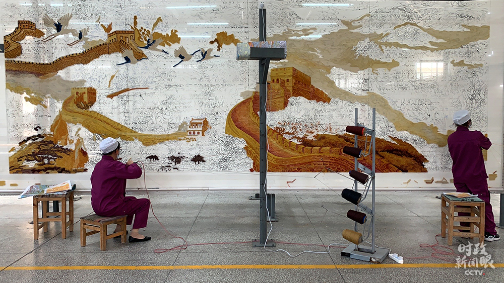 △這幅手工槍刺藏毯以長城為原型,面積接近14平方米。兩人同時操作需兩個月時間完成。(總臺央視記者王鵬飛、楊松濤拍攝)