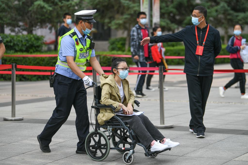 6月7日,交警幫助行動不便的考生進入內蒙古呼和浩特市第二中學(西校區)考點。