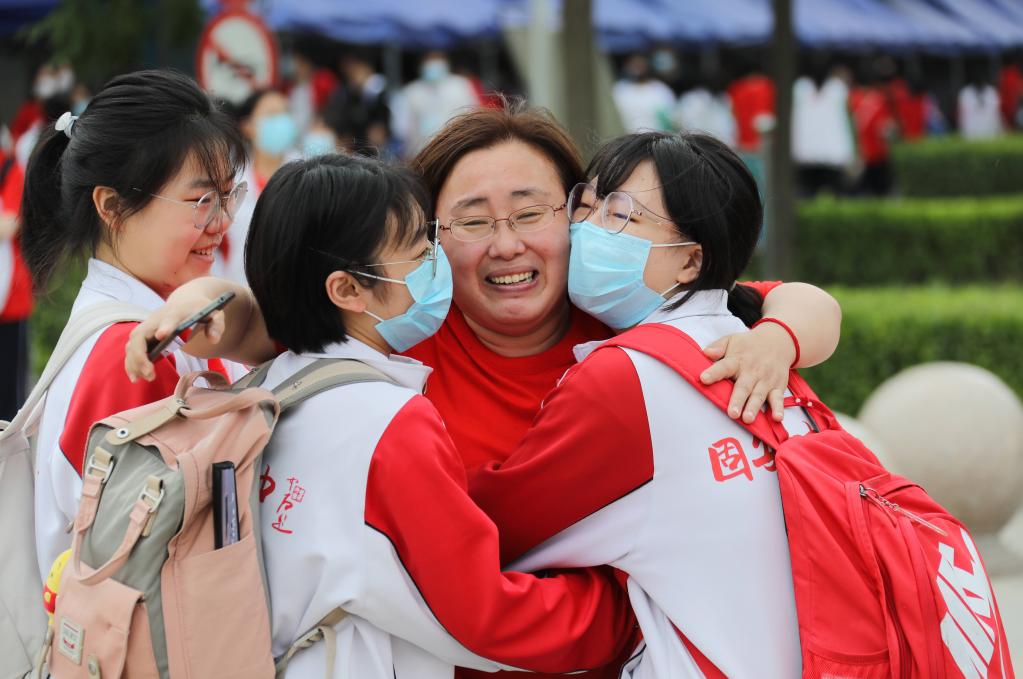 在河北省固安縣第一中學考點,考生結束首場科目考試后與老師擁抱。