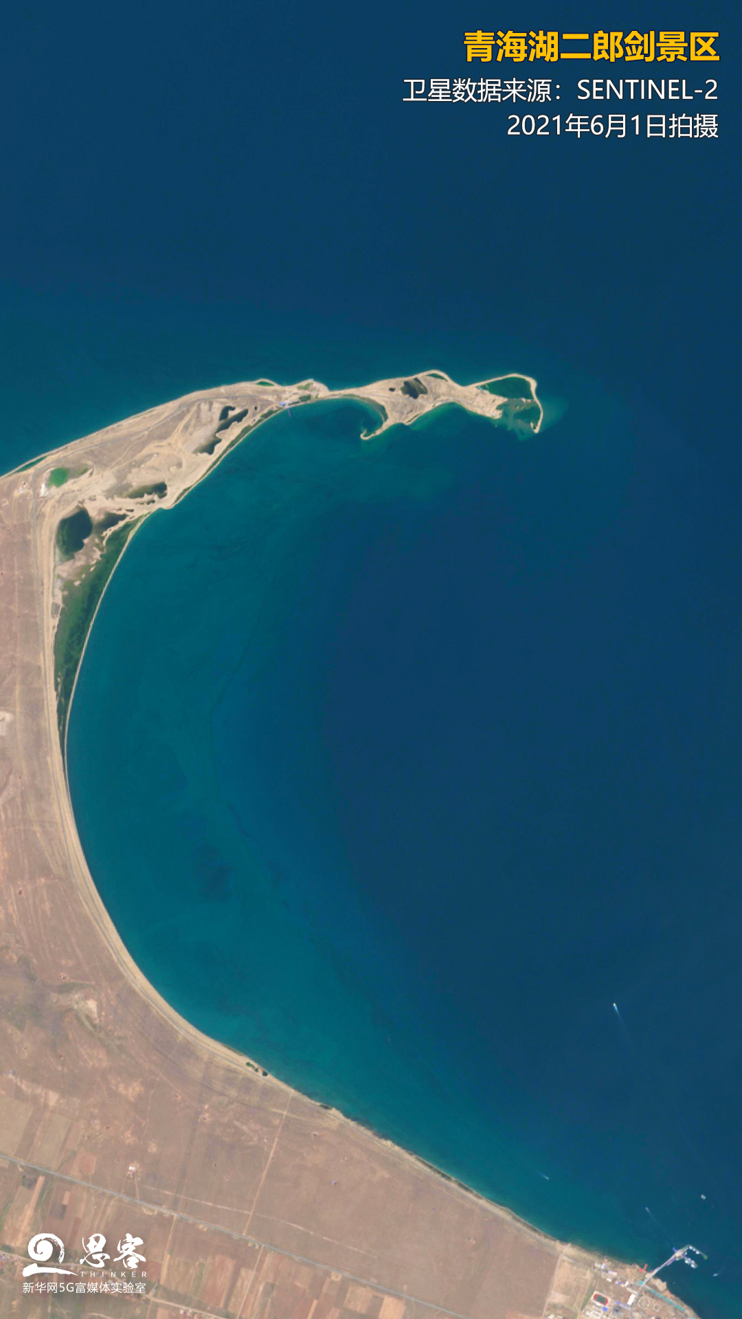 衛(wèi)星視角下的青海湖二郎劍景區(qū)。衛(wèi)星影像來源:SENTINEL-2