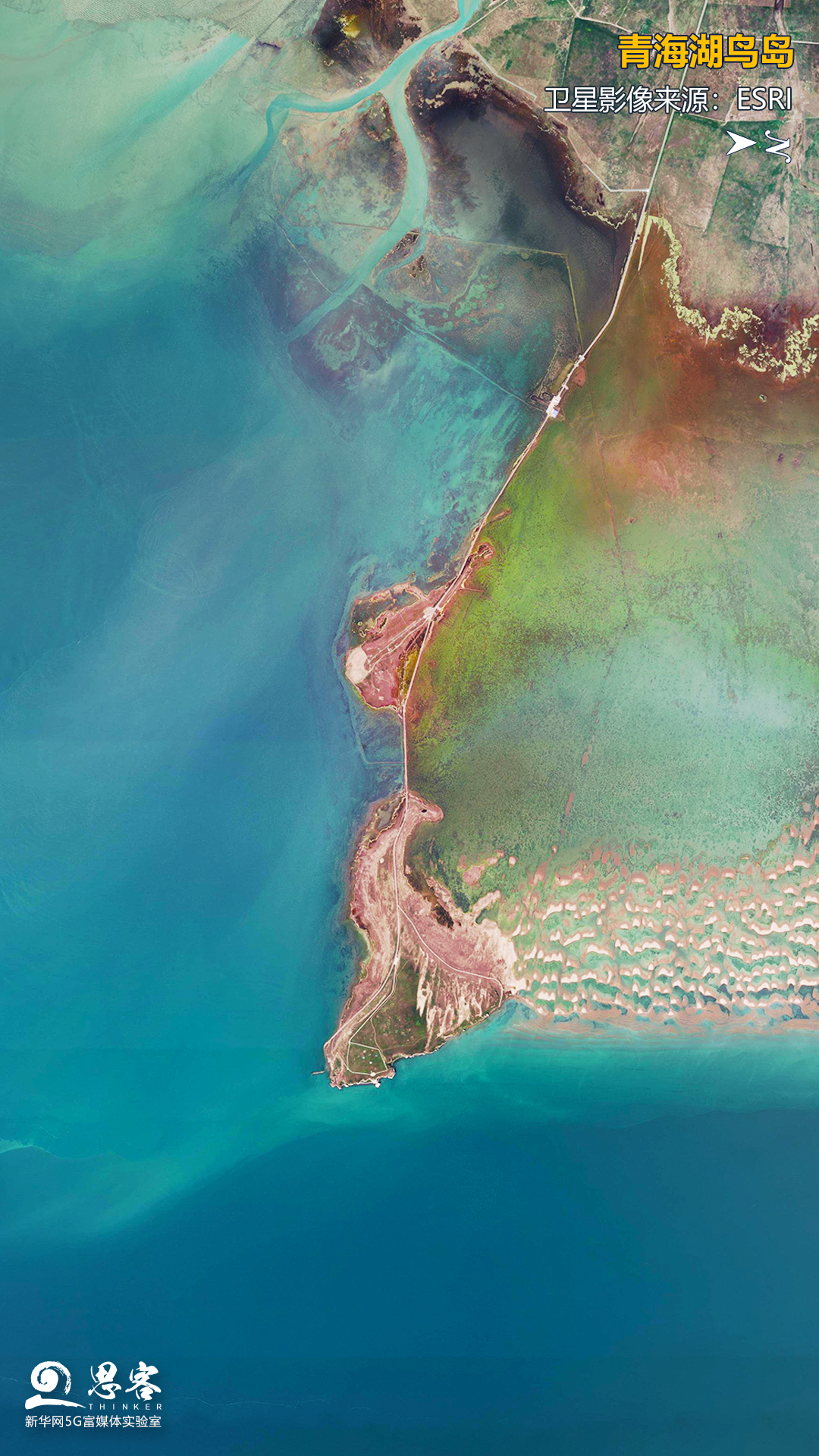 衛(wèi)星視角下的青海湖鳥島。衛(wèi)星影像來源:ESRI