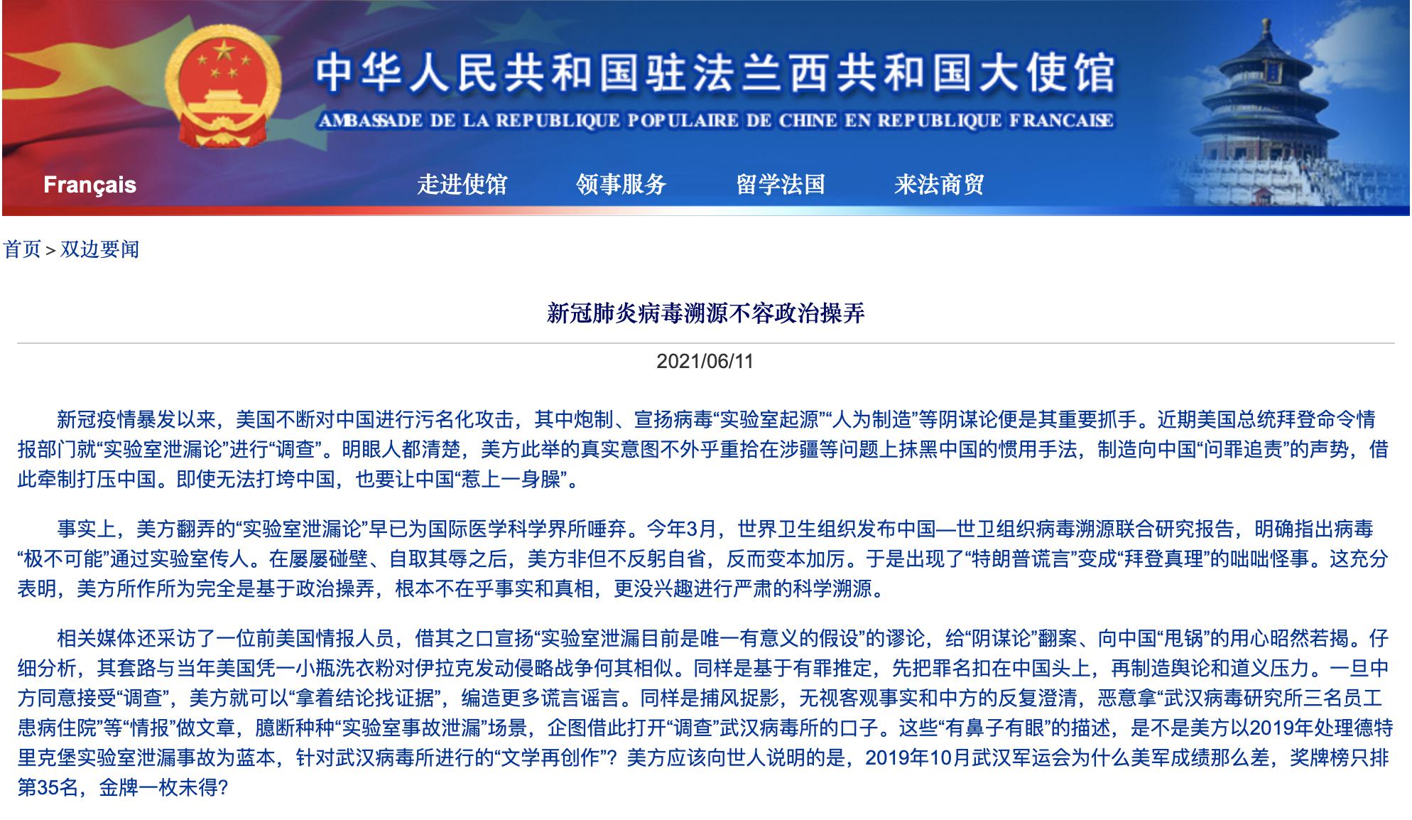當地時間6月11日,中國駐法國大使館發表了題為《新冠肺炎病毒溯源不容政治操弄》的文章,全文如下: