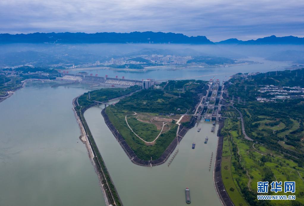 6月20日,船舶有序通過三峽五級船閘(無人機照片)。