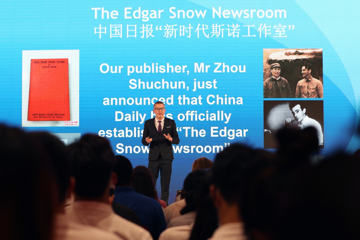 6月20日,為迎接和慶祝中國共產黨成立100周年,展示百年光輝歷程,傳播紅船精神,對外講好中國共產黨的故事,中國日報社聯合中共浙江省委宣傳部和中共嘉興市委于6月20日在嘉興南湖,共同舉辦主題為“從紅船走來:代表歷史前進方向的人民政黨”的“新時代大講堂”;顒悠陂g,中國日報社還宣布成立“新時代斯諾工作室”。工作室將充分發揮報社資深外籍專家和國際友人的作用,對外講好中國故事和中國共產黨的故事,展示真實、立體、全面的中國。中國日報社資深外籍記者聶子瑞(Erik Nilsson)作為嘉賓發表了演講。