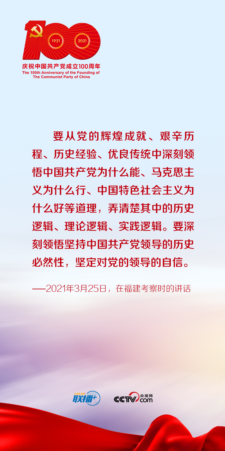 今年是中國共產黨成立100周年。央視網《聯播+》特梳理總書記關于知史愛黨的重要論述,與您一起堅定理想信念,不斷增強守初心、擔使命的思想自覺和行動自覺。