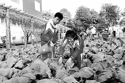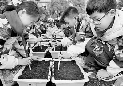 江蘇省太倉市朱棣文小學學生在種植綠色蔬菜。王建康攝/光明圖片